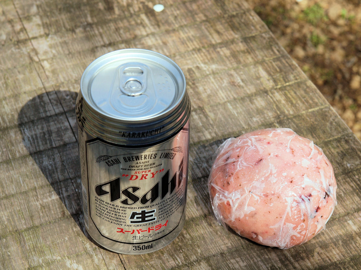 ベンチで一杯(嬉)。肴はこの景色と途中で買った梅味の酒まんじゅうです。