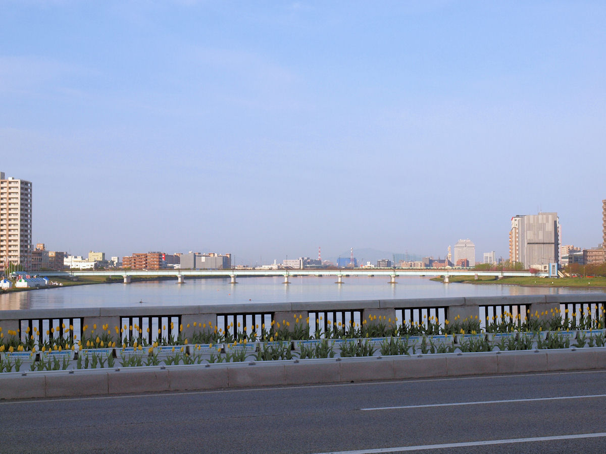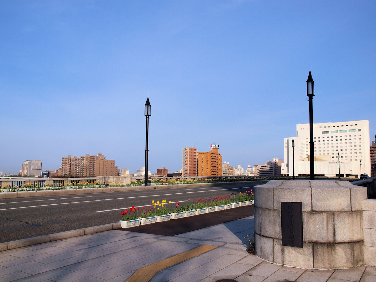 北上すると見えてきたのは信濃橋、チューリップで飾られてました。