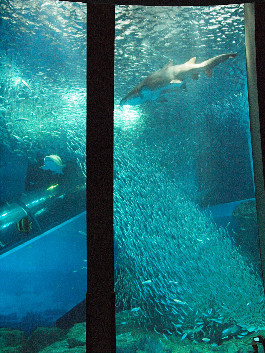 大水槽、群れと輝きの魚たちです。実はここにカレがいるのかと思っていたのですが、お隣の水槽からイワシとシロワニ(サメ)が移ってきてました。