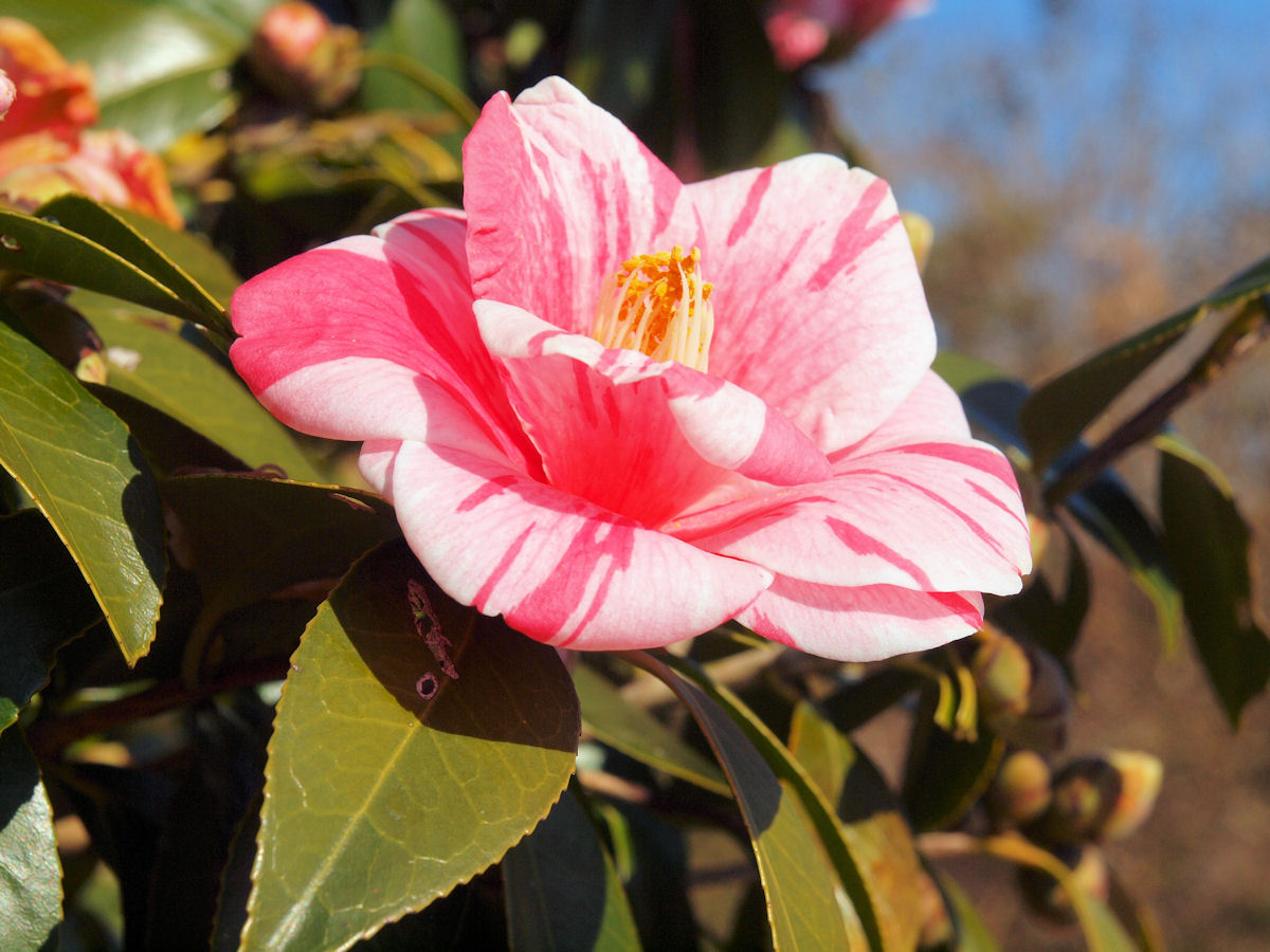 小さなビニールハウス?に咲いていた季節はずれのバラと椿です。
