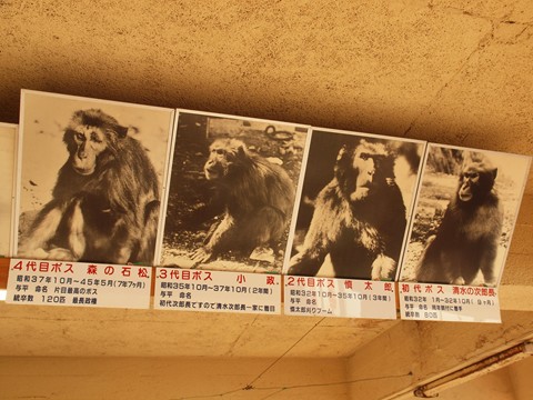 バスを降りるとすぐに入る売店のような建物…そこに掛けてあった歴代ボスのお姿…初代:清水次郎長、4代:森の石松…幼少の頃に聴いたことがあって頭の片隅に残っていた名前・・・ここの猿達のことだったんですね。