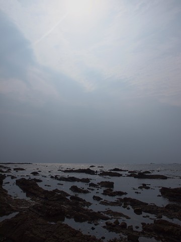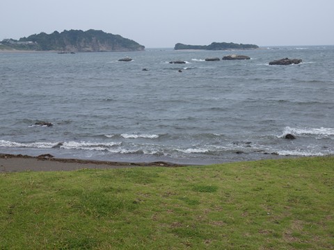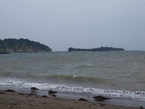 大浜海水浴場から改めて長者ヶ崎、あの二つの島??の間に浜があるんです、立ち入り禁止なのが残念。