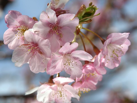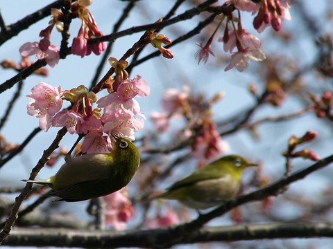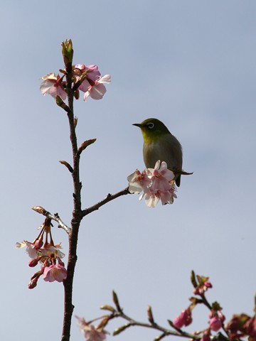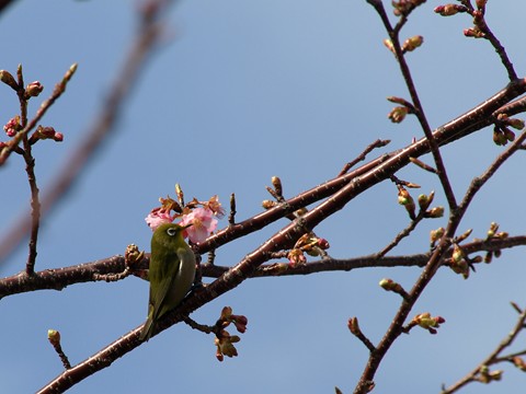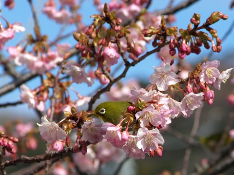 川津桜・・・、とってもきれいですね。メジロは花の蜜で春を味わっているのでしょうね♪