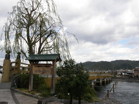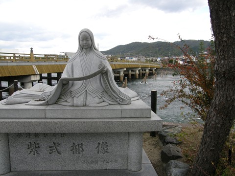 宇治橋傍の紫式部像。ここ宇治川周辺は源氏物語の『宇治十帖』の舞台、平等院は元々は光源氏のモデル、嵯峨源氏の源融の別荘でした。